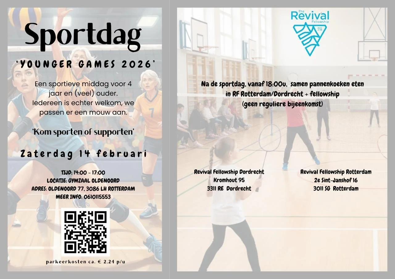 Sportdag & Pannenkoekavond Dordrecht en Rotterdam zaterdag 14 februari 2026 2:00 p.m. 7:00 p.m. 14:00 19:00 Revival Fellowship Holland 77 Oldenoord 3086 LH rotterdam Netherlands (kaart) Google Agenda ICS